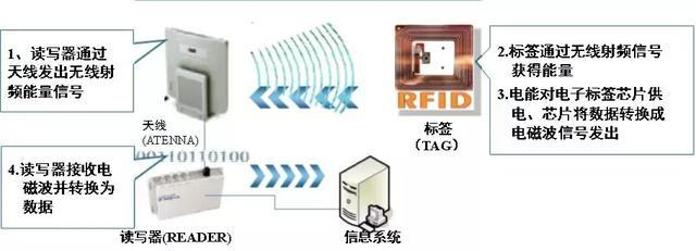 RFID的工作原理很簡單:標(biāo)簽進入磁場后,讀寫器會感應(yīng)到標(biāo)簽信號,標(biāo)簽通過無線射頻信號獲得能量(無源標(biāo)簽或被動標(biāo)簽)或標(biāo)簽主動發(fā)送某一頻率的信號(有源標(biāo)簽或主動標(biāo)簽),然后解讀器讀取電磁波并轉(zhuǎn)化為數(shù)據(jù),送至中央信息系統(tǒng)進行有關(guān)數(shù)據(jù)處理。